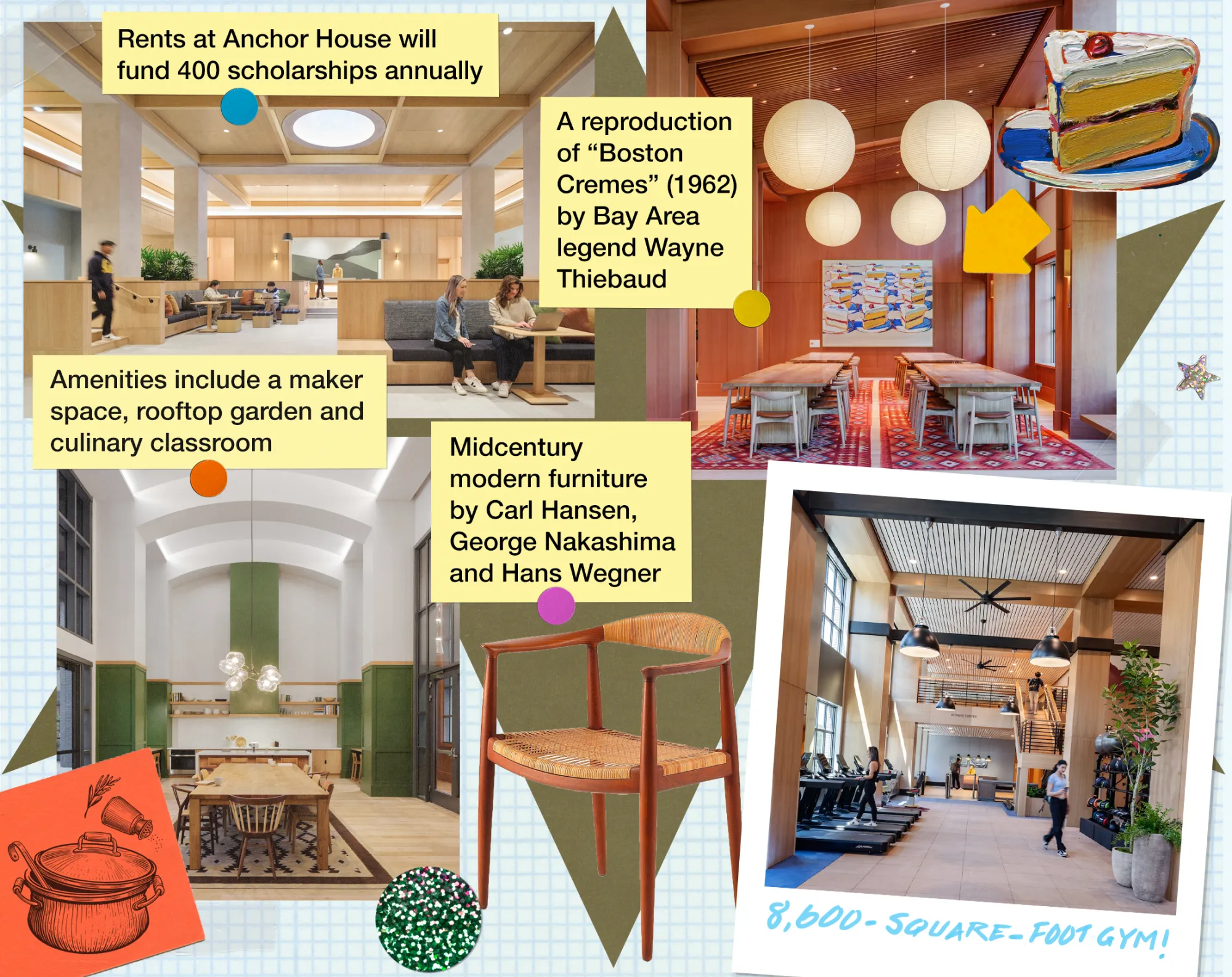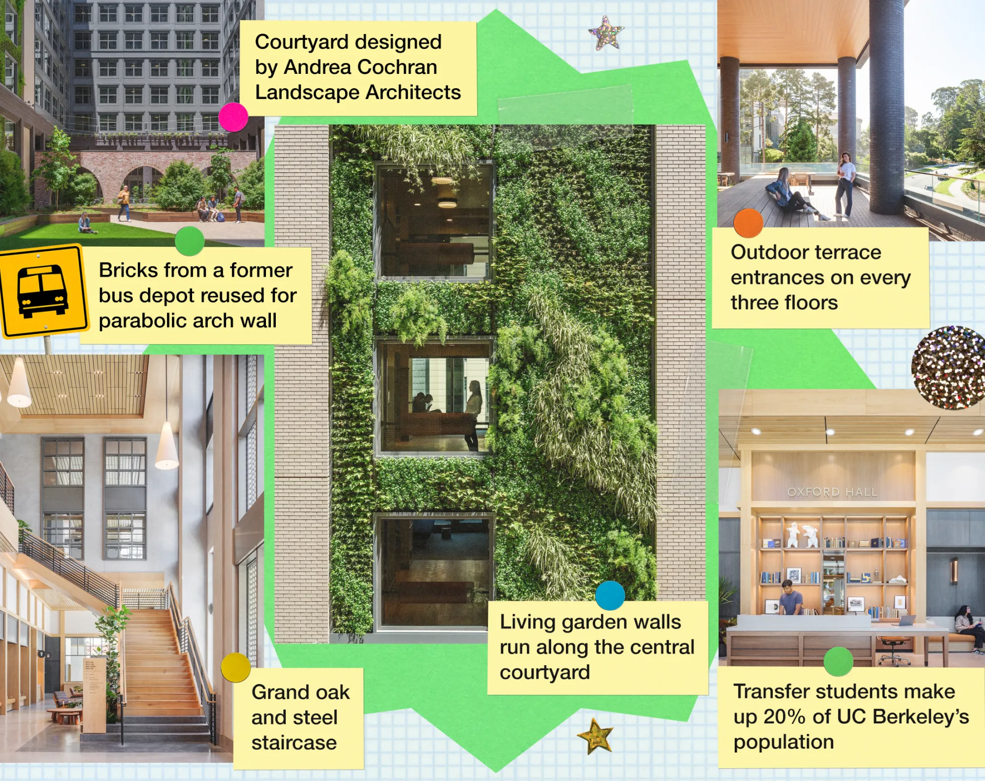 其他设施包括一个大型健身中心、一个创客空间、屋顶花园和烹饪教室。这些空间也向住在校外的人开放:对于通勤到伯克利的转学学生,建筑内设有储物柜和学习社交的空间。