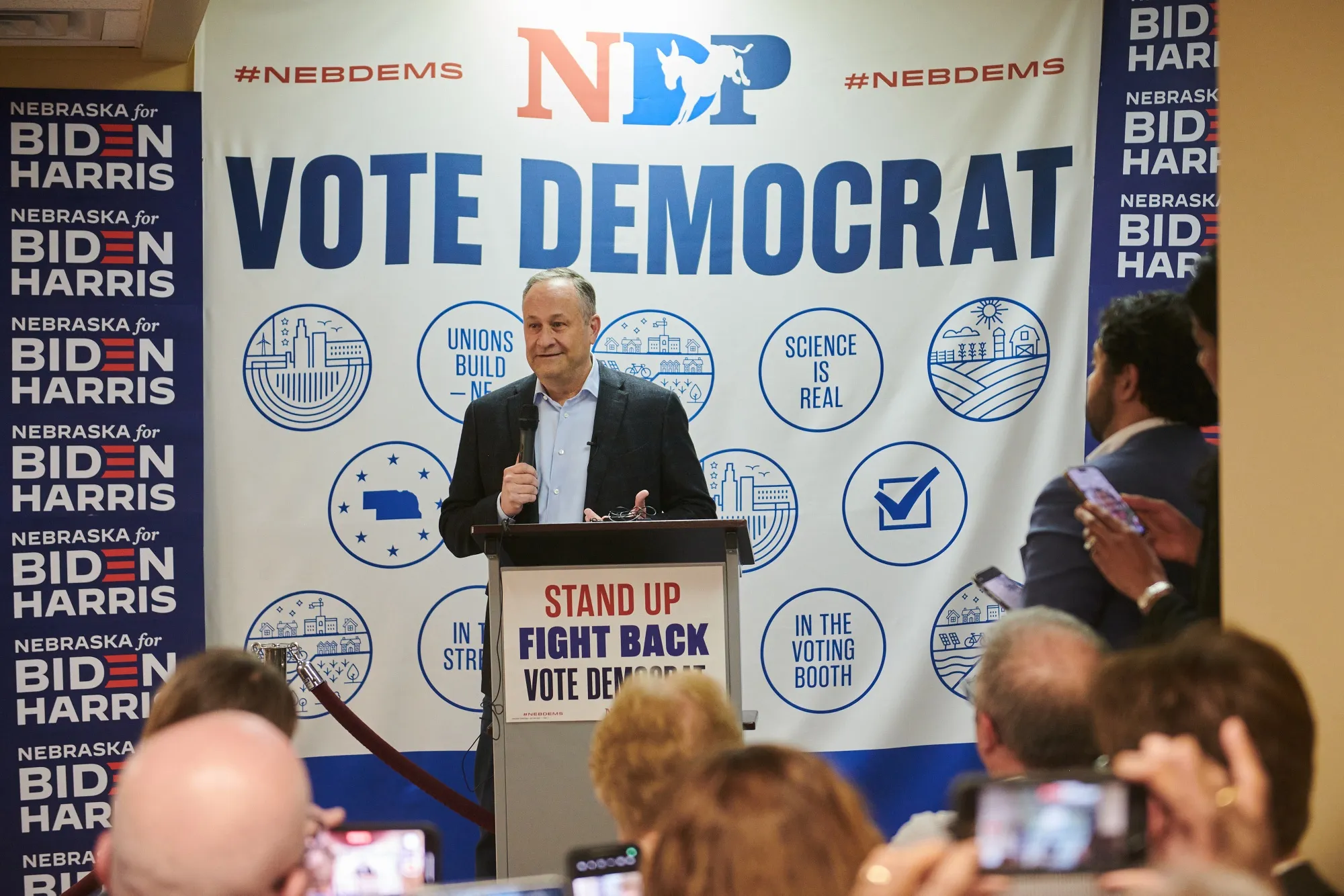 美国第二位绅士道格·埃莫夫在3月19日与当地民主党人在奥马哈的内布拉斯加州民主党办公室举行会议,几个月前他的妻子、副总统卡马拉·哈里斯成为候选人。摄影师:丹·布鲁伊莱特/彭博社### 蓝点