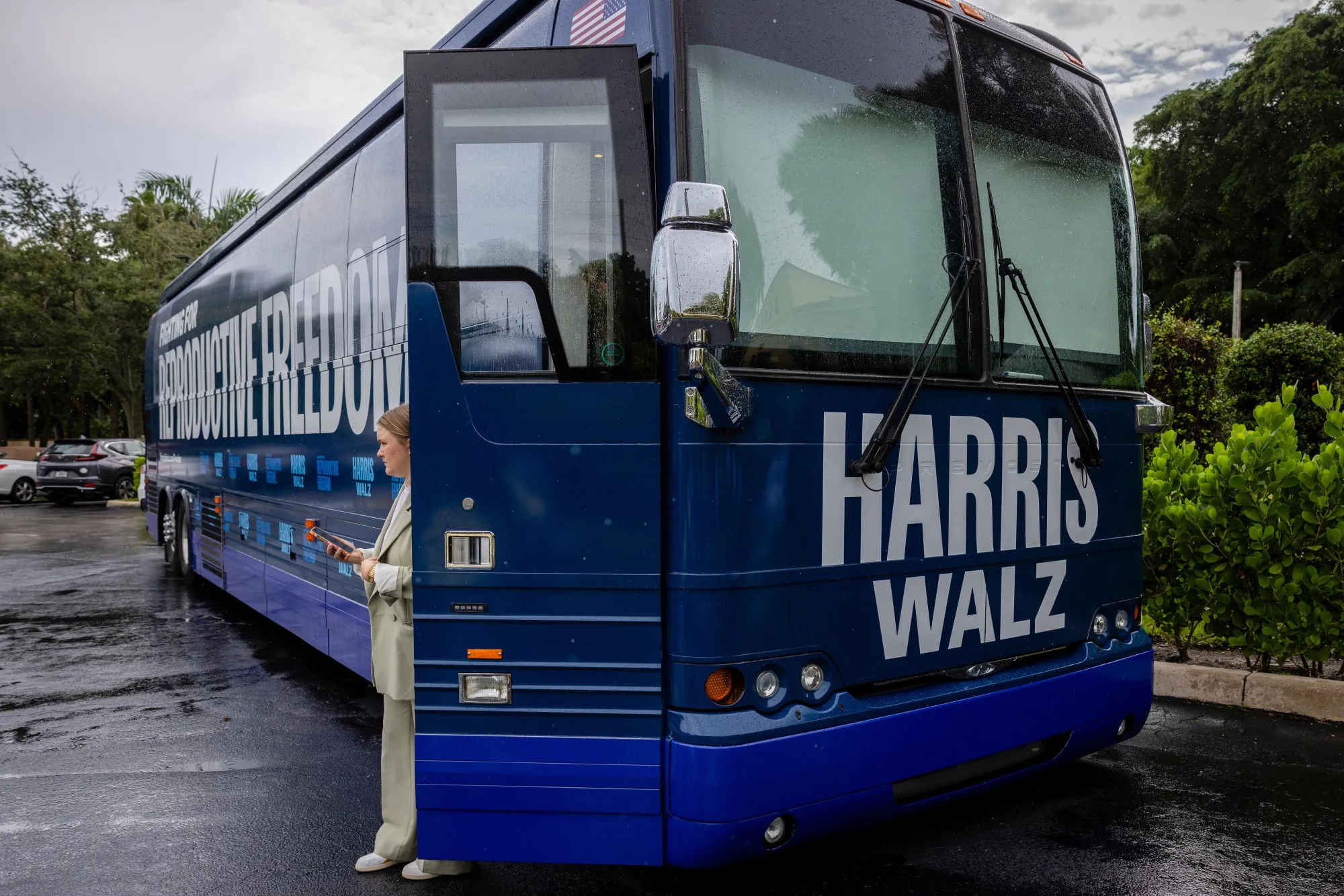 在佛罗里达州哈里斯-沃尔兹竞选生育权巴士巡回活动启动期间的生育自由巴士。摄影师:埃娃·玛丽·乌斯卡特基/Bloomberg### 积极投票者