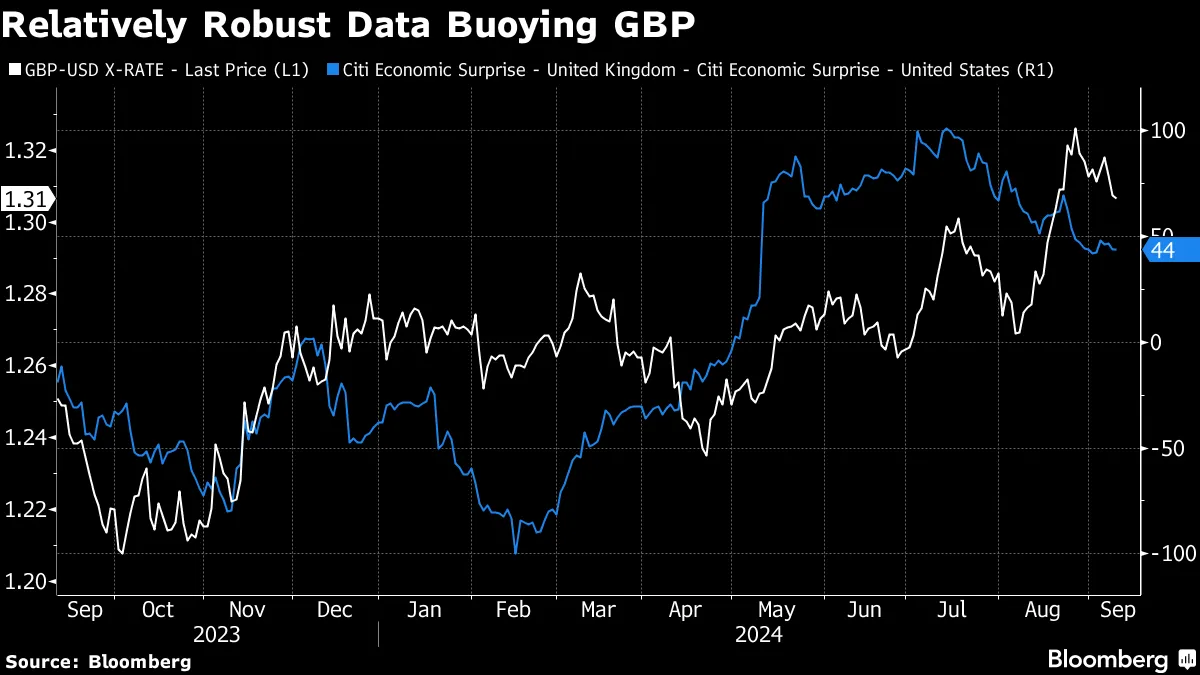 今天的数据亮点将是今早的英国就业情况。薪资增长可能会放缓,但根据彭博经济学,英格兰银行可能会在利率削减上保持谨慎,因为潜在的成本压力仍然很高。与此同时,英国财政大臣瑞秋·里夫斯可能会在即将到来的预算中推动超过200亿英镑(260亿美元)的 增税,而不违反任何选举承诺,目标是遗产和资本收益,根据解决方案基金会的说法。今天英镑变化不大,但今年迄今对美元上涨超过2%,表现优于主要同行。
