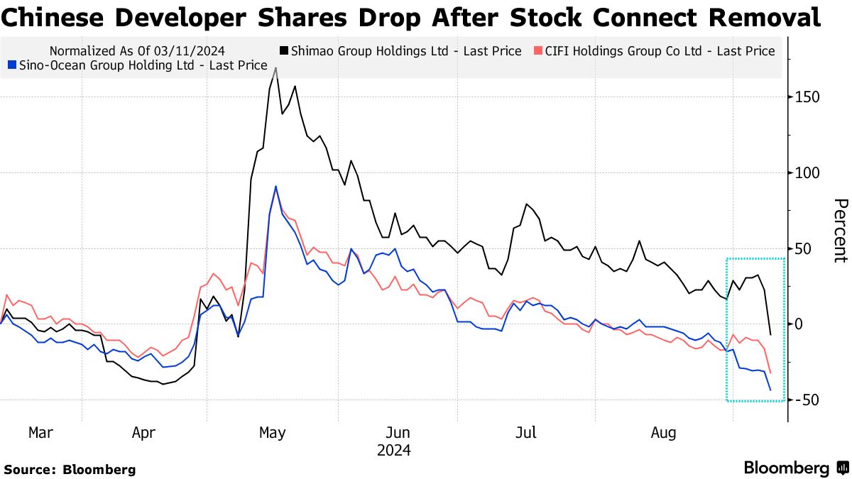 世茂集团控股有限公司的股票在周二下跌了多达30%,是超过一年来的最大跌幅,此前它被剔除出连接上海和深圳证券交易所与香港交易所的股票通计划。中海地产集团有限公司和中海集团控股有限公司的股票各自下跌超过20%,而彭博情报的中国开发商指数下跌了多达5.3%,降至自四月以来的最低点。