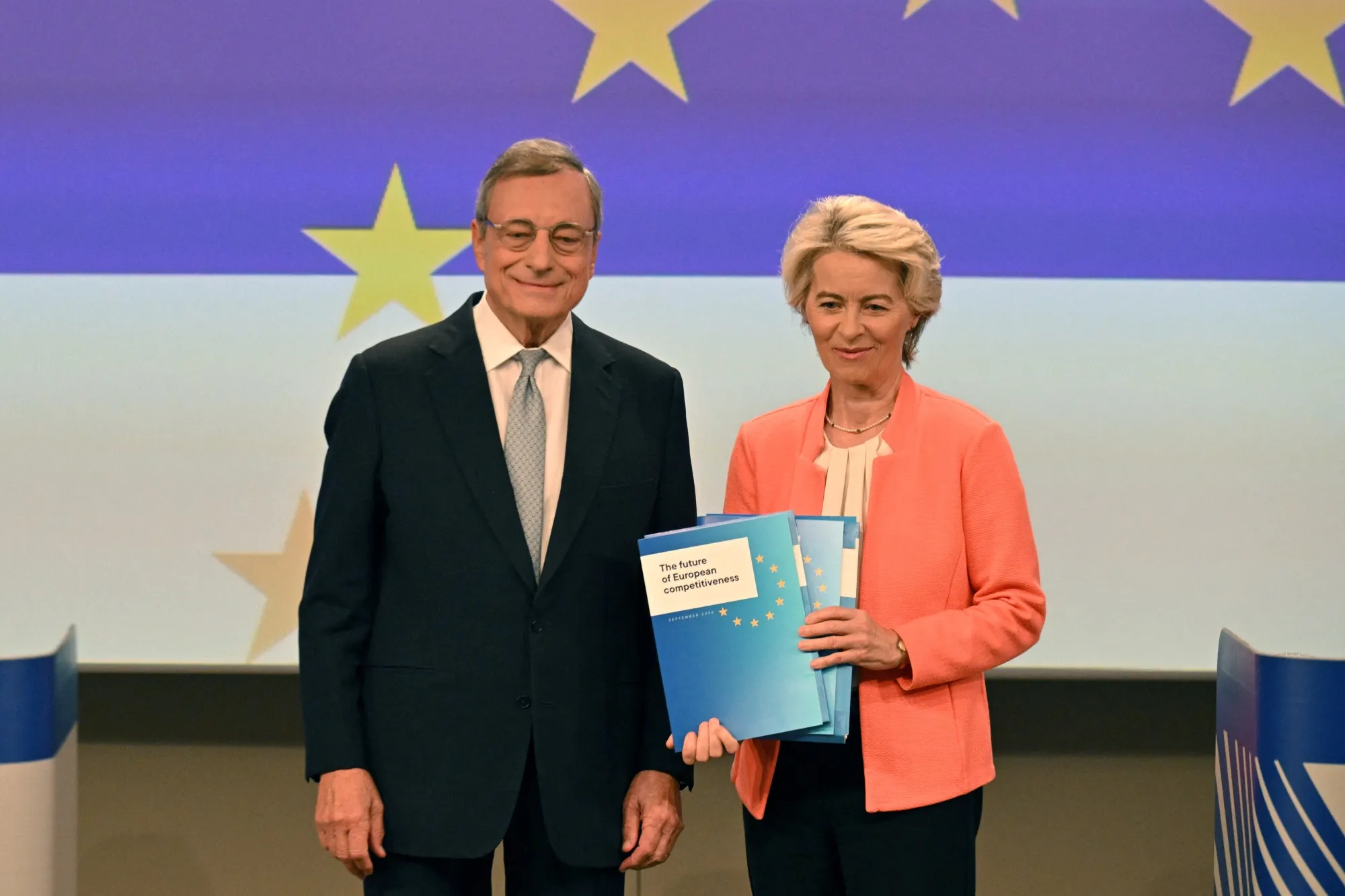 马里奥·德拉吉和欧洲委员会主席乌尔苏拉·冯·德莱恩在2024年9月9日于布鲁塞尔的欧盟总部举行的关于欧洲竞争力未来的联合新闻发布会上展示文件。