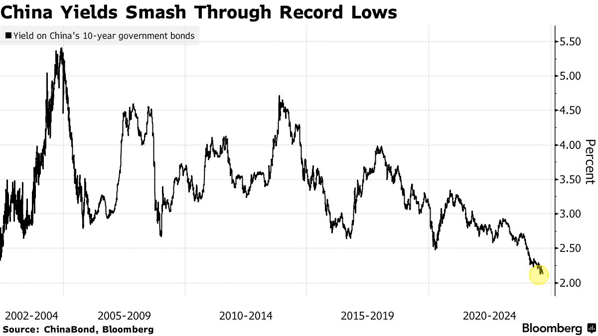 自上个月以来,中国的利率交易者一直处于紧张状态,当时北京对火热的债券市场的抵制从 口头警告 发展为直接的 干预。尽管如此,本周投资者仍将政府 收益率 压至新低,因为国家的经济疲软、股市下跌和房地产价格下滑继续损害风险偏好。