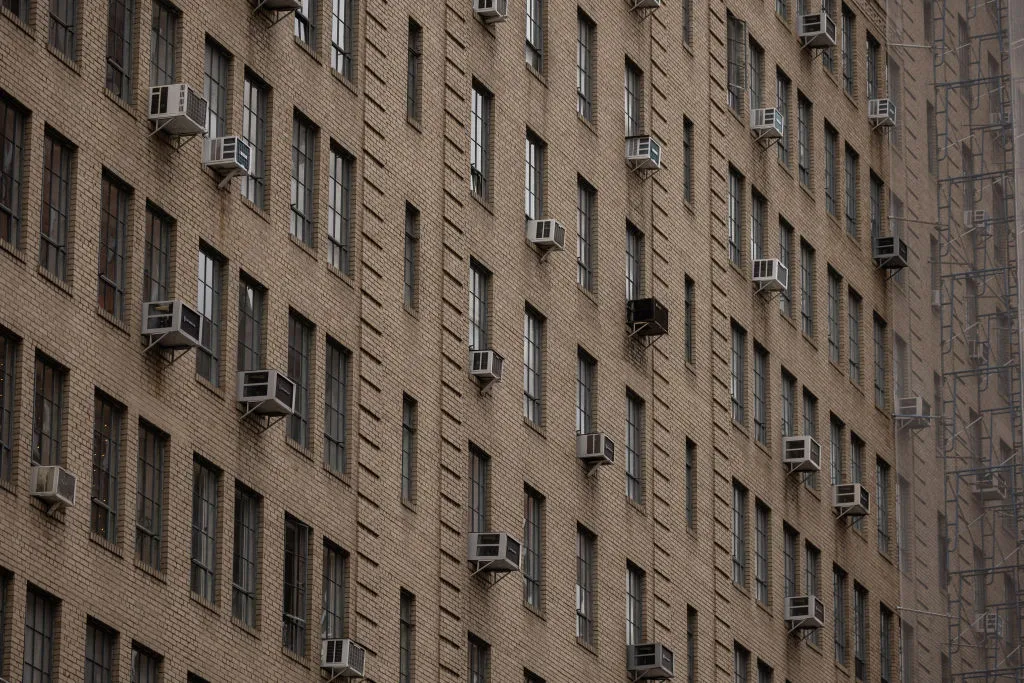 纽约市中城一个公寓楼的空调设备。该市正在考虑一项提案,要求出租房屋配备空调。