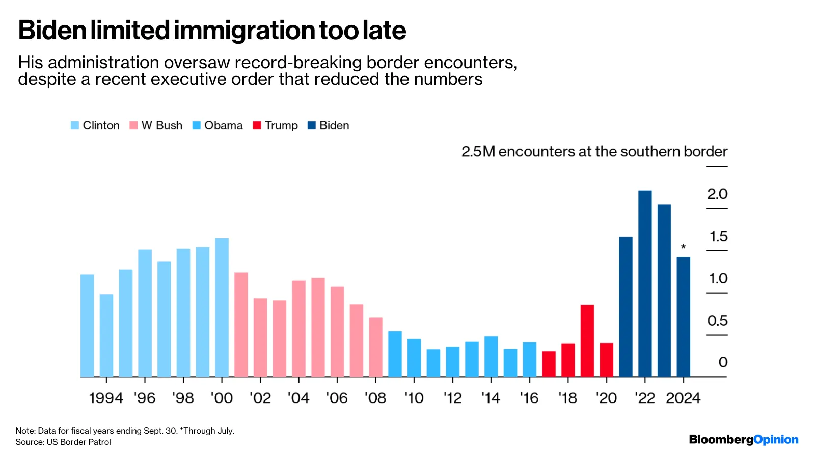 詹姆斯·吉布尼指出,“在经历了四年创纪录的南部边境移民后,可能已经太晚了,无法转移批评。”他指出“在入境口岸之间的遭遇超过800万次”,以及庇护案件积压的数量翻倍。最近的一项行政命令将美国边境巡逻的遭遇数量恢复到特朗普执政时的水平,詹姆斯表示哈里斯的边境立场“更符合现实”,而不是唐纳德·特朗普提议的墙和他“道德破产、经济灾难和后勤不可能”的计划,试图驱逐超过1100万无证移民。然而,他根本上表示,国家需要两党立法来修复移民系统。