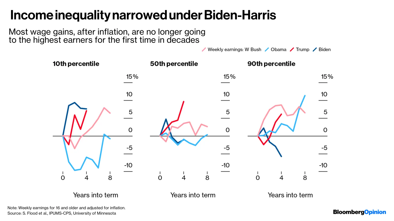 这并不是一帆风顺。正如艾莉森·施拉格所写,大多数美国人在调整通货膨胀后并没有看到工资的显著改善。从技术上讲,实际工资动态在一定程度上减少了不平等,因为底层10%的工资有所增加,而第50百分位基本持平,最高收入者的实际工资则下降。但理想情况下,你会希望在更乐观的情况下看到收入差距缩小。