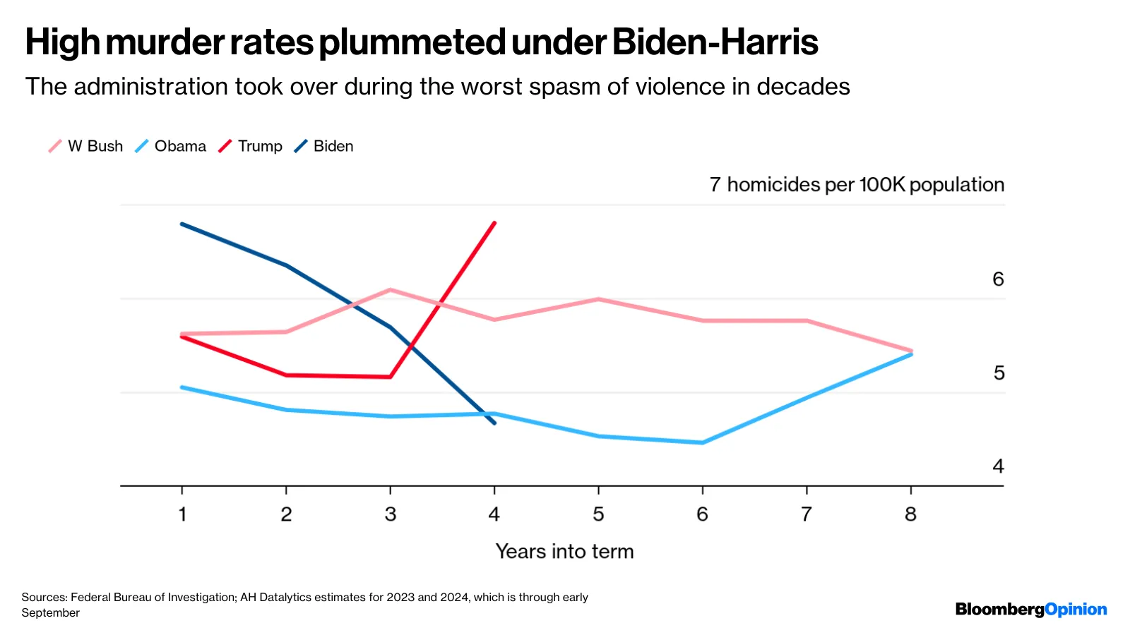彭博社观点为什么印度的市场监管机构需要更严格的控制最快的选择是最有趣的西南航空首席执行官拯救了他的工作,也许还拯救了航空公司马斯克的人工智能副业应该与特斯拉保持距离让我们从积极的方面开始。在犯罪方面,贾斯廷·福克斯写道,当乔·拜登总统上任时,美国正处于暴力爆发的中间。但自2021年秋季以来,谋杀案数量一直在下降,联邦调查局和主要城市首席协会的报告表明,其他暴力犯罪也开始减少。“特朗普反复试图将犯罪问题作为主要竞选议题,但不幸的是,事实是,在他于2021年1月离任时,大多数指标显示情况要糟糕得多,”福克斯写道。