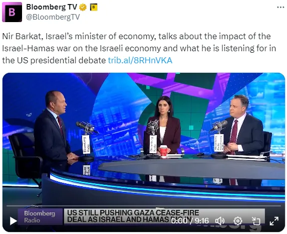 今天在彭博电视台的 权力平衡 早间版中,主持人乔·马修和凯莉·莱因茨采访了以色列经济部长尼尔·巴尔卡特,讨论以色列-哈马斯战争对GDP增长的影响,以及他在美国总统辩论中关注的内容。