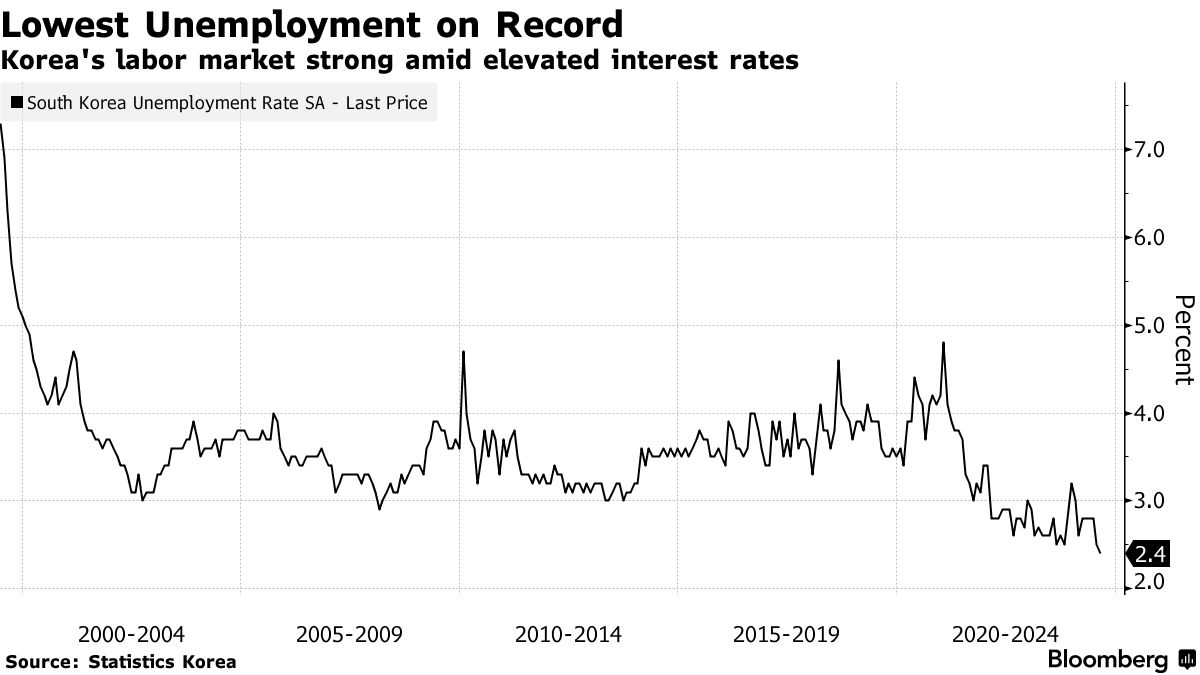 韩国的失业率上个月降至创纪录的低点,显示出劳动市场的持续强劲,帮助减轻了市场对中央银行即将政策转变的信心。