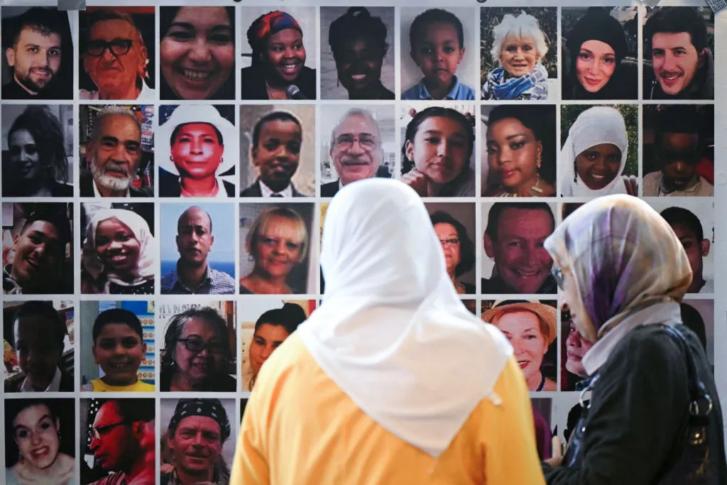 一面展示2017年伦敦西部格伦费尔塔火灾中遇难者照片的墙。
