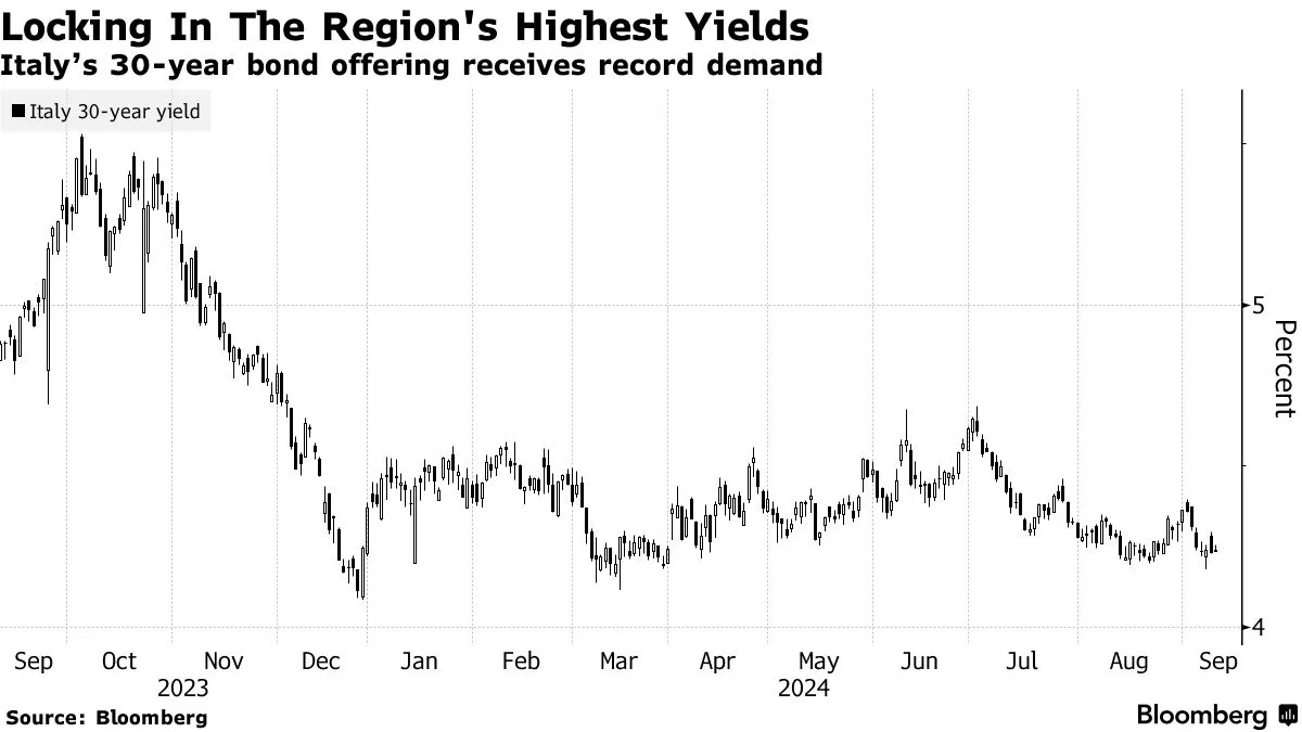 意大利新发行的30年期债务吸引了超过1300亿欧元的订单,订单簿 超过了疫情后2020年创下的前纪录。随着欧洲央行开始降息周期,意大利的收益率在最近几个月下降,政策制定者预计明天将把存款利率再下调25个基点至3.5%。