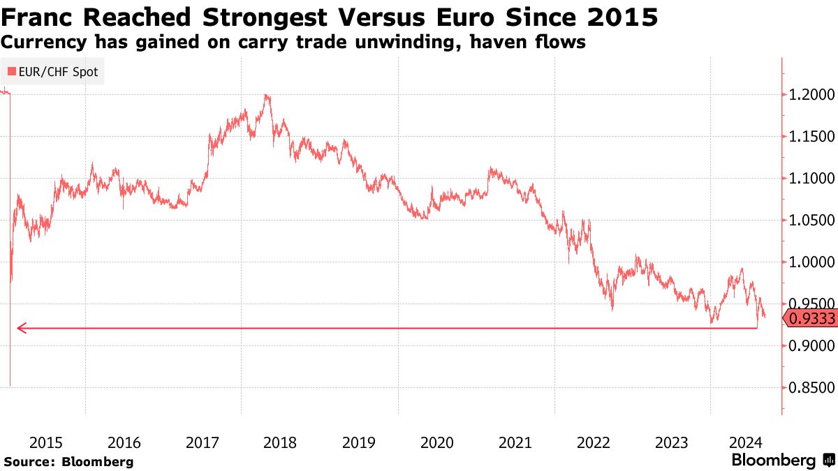 法郎自七月初以来对美元上涨了约6%。这一上涨发生在流行的套利交易——以低收益货币融资——开始减弱之际,同时避险资产的流入也有所增加。上个月,法郎触及自2015年以来对欧元的最强水平。