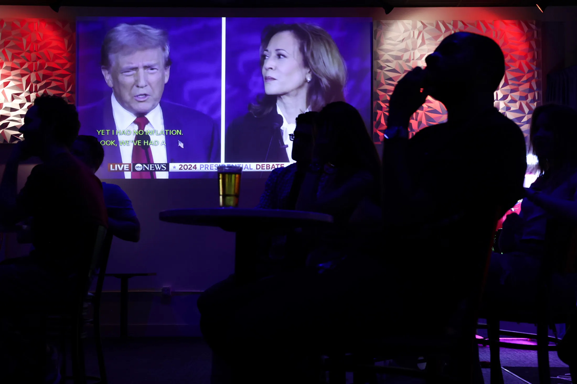 人们在华盛顿的观赛派对上观看总统辩论。摄影师:亚历克斯·王/美联社北美这对哈里斯和特朗普来说都是一个挑战——吸引这小部分尚未决定的美国人,并将自己塑造成国家的前进方向。