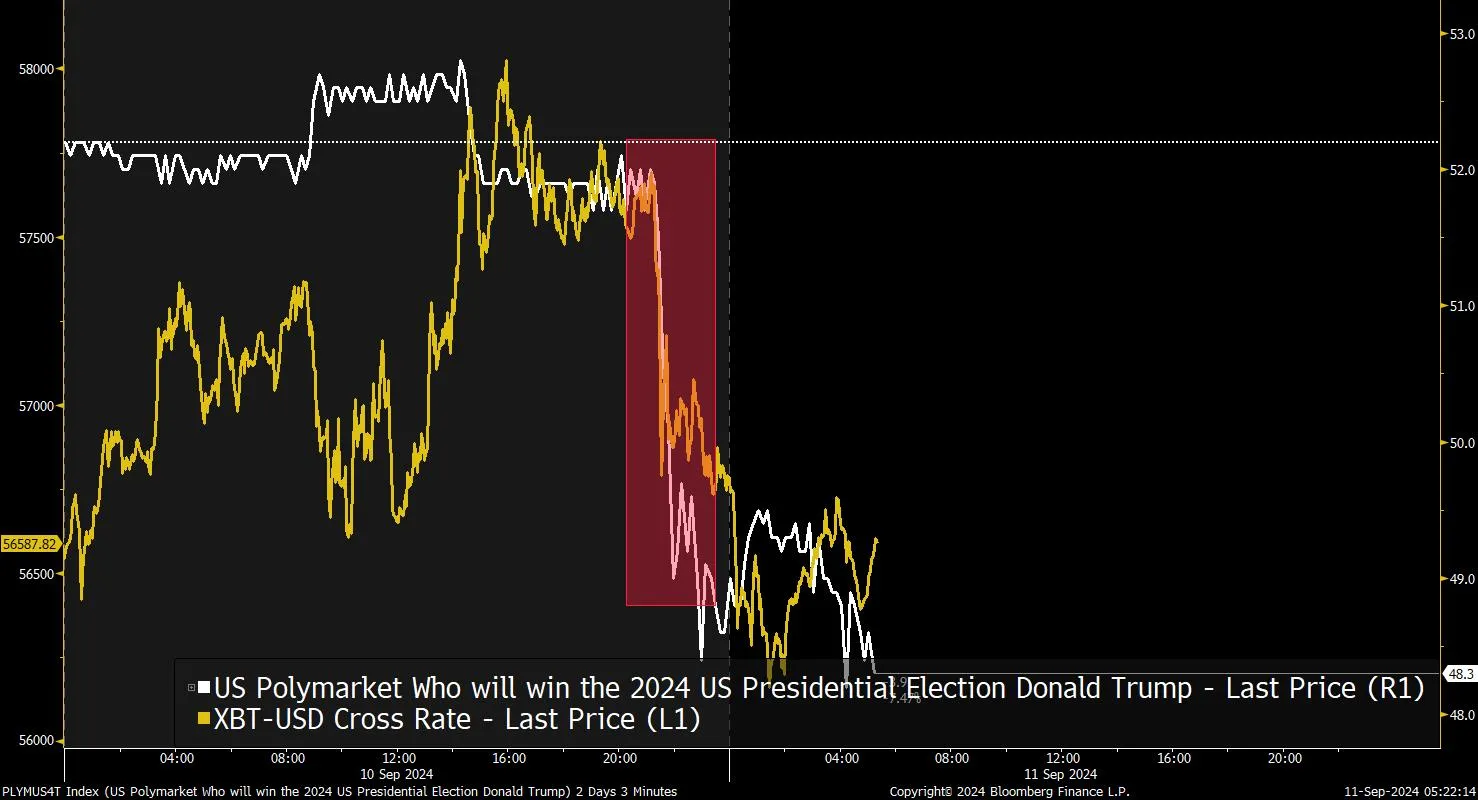 通胀数据发布前的准备和辩论后的影响在市场上产生了几种交错的趋势。周三,两年期国债收益率滑落至2022年以来的最低水平,因为降息预期占据主导,而美国股指期货则小幅下跌。与此同时,比特币在辩论后五天内首次下跌,因为投注赔率更倾向于哈里斯——她尚未详细说明对加密货币的政策立场——而特朗普则在之前称其为“骗局”后,转向迎合数字资产行业。