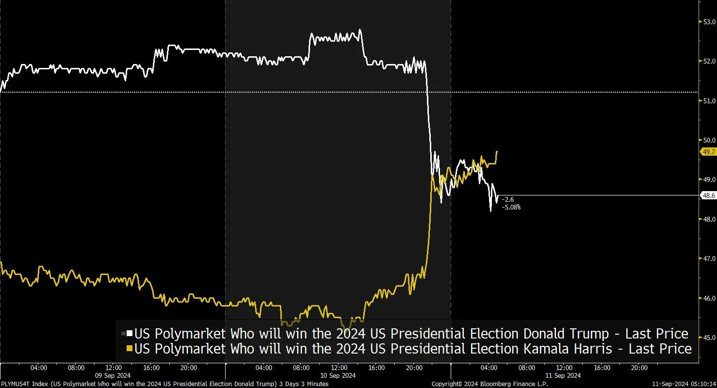 这些数据发布后,投资者密切关注的另一个事件是:美国总统辩论,令共和党人唐纳德·特朗普在民主党人卡马拉·哈里斯面前处于防守状态。最初的争论集中在经济和移民问题上。特朗普攻击哈里斯的边境政策,而哈里斯强调她的议程是“提升中产阶级和美国工人的生活”。辩论后的反应平淡,资产反应不大,而博彩市场则转向支持哈里斯,她还获得了亿万富翁流行巨星泰勒·斯威夫特的支持。