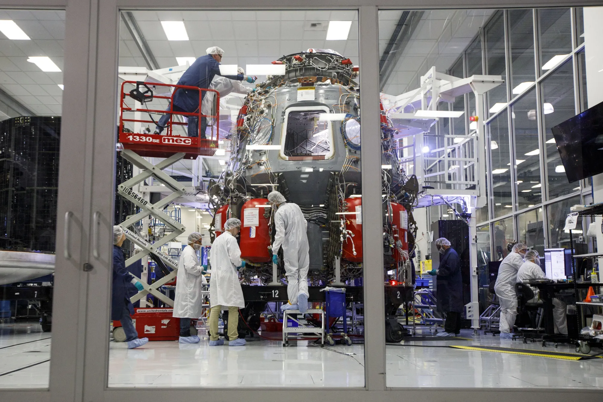 员工在加利福尼亚州霍索恩的SpaceX总部的洁净室内工作,进行Crew Dragon舱的工作。