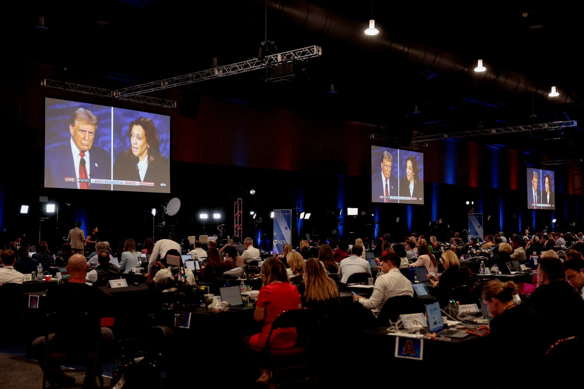 唐纳德·特朗普和卡马拉·哈里斯在宾夕法尼亚州费城的宾夕法尼亚会议中心第二场总统辩论的旋转房间中出现在屏幕上,时间是9月10日。