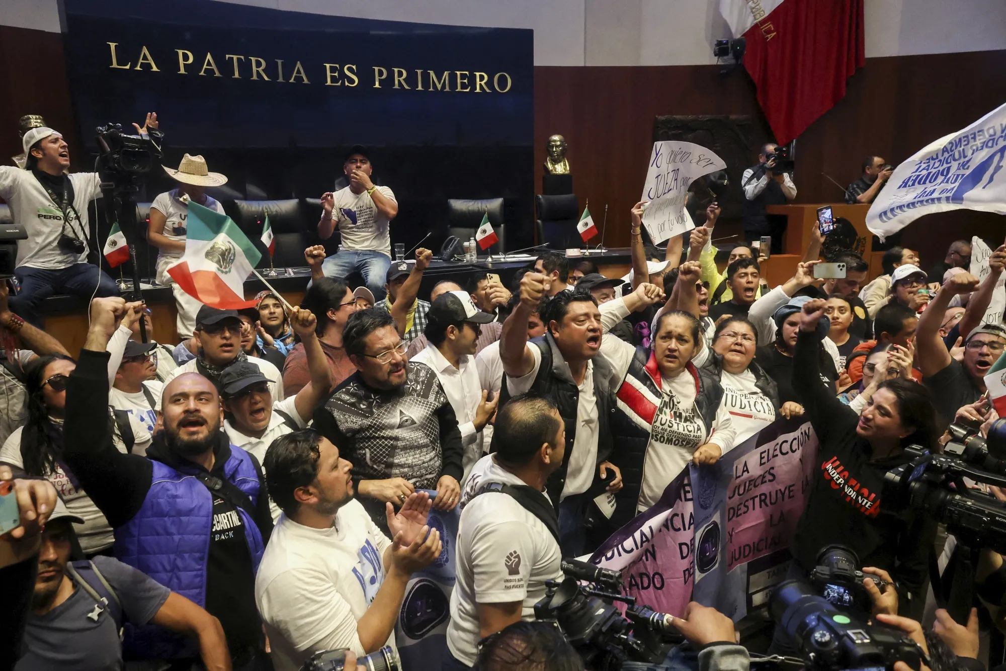 9月10日,墨西哥城立法机构上院内的示威者。摄影师:Silvana Flores/AFP 通过 Getty Images周二,反对改革的抗议者试图阻止国会程序,冲进参议院大厅。当立法者在几个小时后在另一栋建筑中恢复会议时,警察在外面排成一列,以防止游行者再次闯入。