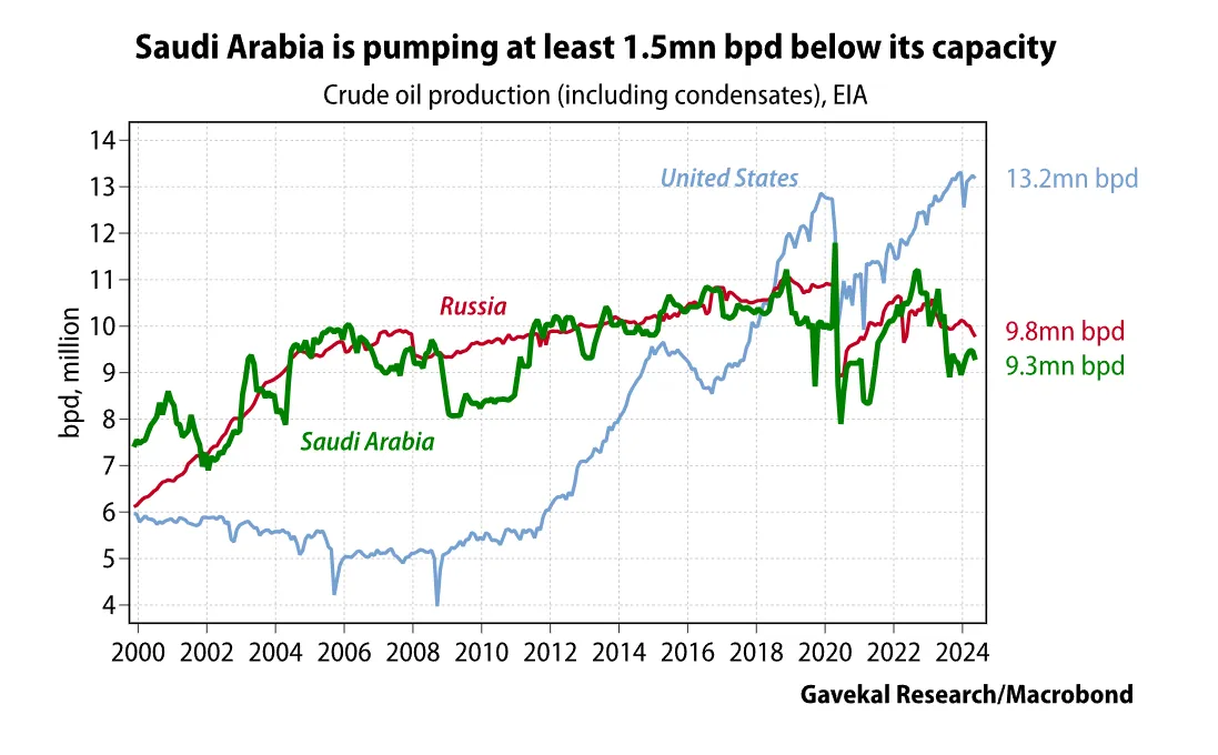 无论11月谁赢得选举,都几乎没有迹象表明价格会恢复。哈里斯和特朗普都支持扩大生产,这在主要生产商已经低于峰值产出水平的供应过剩中毫无意义。Cetera金融集团的基因·戈德曼表示,特朗普增加钻探将激发能源行业的并购活动。哈里斯的清洁能源计划和重生的水力压裂支持对需求几乎没有促进作用,这意味着价格前景依然低迷。这张Gavekal图表显示,如果需要,大型参与者还有很多空间来增加供应: