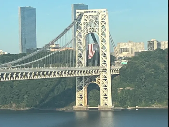 永远不要忘记。今天在曼哈顿是一个美丽的晚夏日,就像23年前一样。阳光从晴朗的天空洒下,今天早上我从窗户看到的景象就是这样的。这是乔治·华盛顿大桥,连接新泽西州和纽约的最繁忙通道。每年在9/11,旗帜悬挂在它的两座金属塔之间,这里曾是许多在世贸中心工作的人们通往城市的门户: