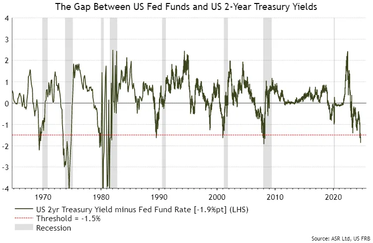 这现实吗?当然,如果你预期经济将大幅放缓。但如此深且持久的联邦基金利率下降,通常不会在没有经济衰退的情况下发生。正如绝对策略研究的伊恩·哈内特在这张图表中所示,在过去60年中,每当两年期国债收益率(主要受联邦预期驱动)降至联邦基金利率以下如此之深时,衰退往往会随之而来: