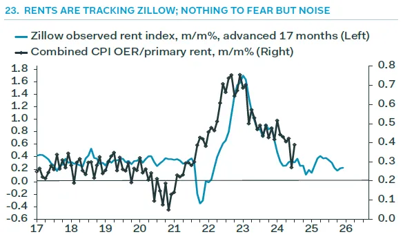 然后是住房通货膨胀本身,略有上升。这使我们面临测量方面的困难统计问题。劳工统计局的方法关注现行的平均租金,因此变化速度远远慢于基于每月新签租约的私营部门指数。来自潘西昂宏观经济学的这张图表显示,Zillow保持的租金指数往往能相当准确地预测官方数据,但有17个月的滞后。如果这种模式持续下去,住房通货膨胀下降只是时间问题: