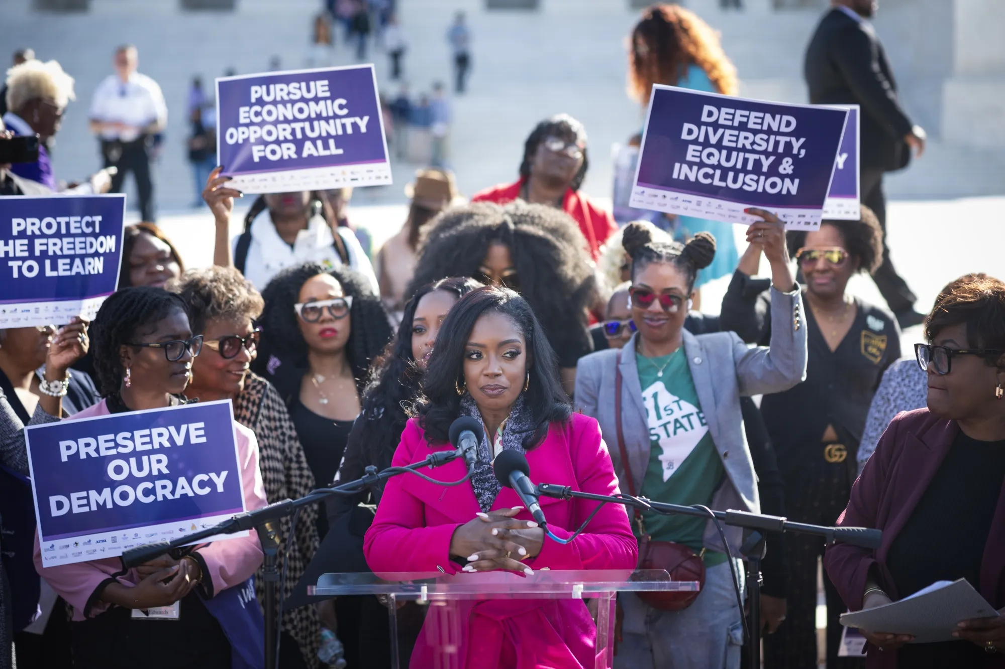 Arian Simone,Fearless Fund的首席执行官,于3月14日在华盛顿特区美国最高法院外发言。