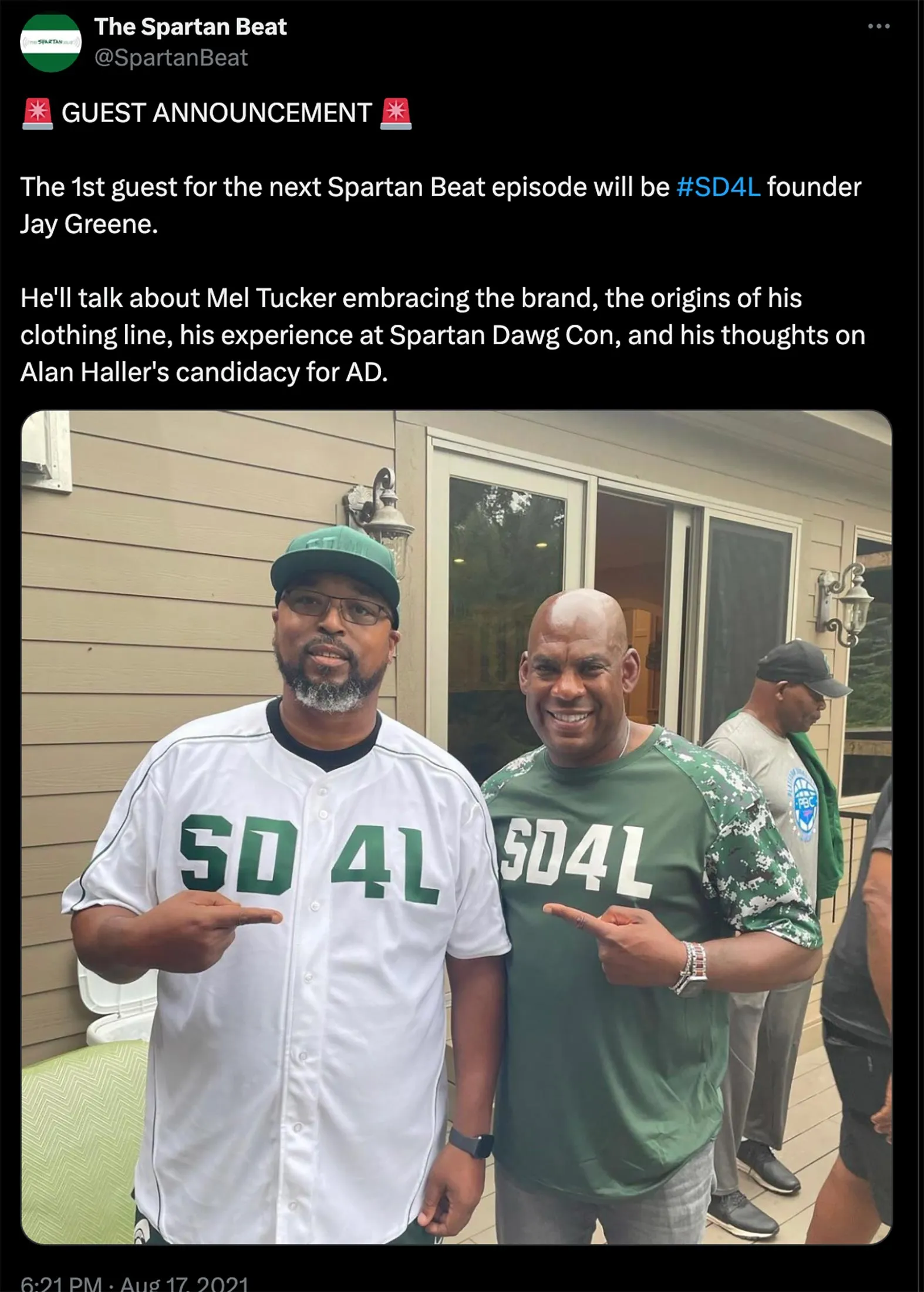 正如圣安德烈 后来所描述的,有一天他恰好和一些前密歇根州立大学球员在一起参加橄榄球训练。其中一位是名叫杰伊·格林的前斯巴达紧端锋。膝盖受伤影响了格林的橄榄球生涯,此后他一直在团体之家和县青少年中心与有风险的孩子们一起工作。格林通过出售印有“斯巴达犬4生命”口号的T恤和其他装备赚取零花钱,这个口号改编自一个前球员的Facebook小组名称。塔克教练本人也穿着SD4L的装备,这个标签开始在球迷网站上出现。“SD4L不仅仅是一个标签,”格林 在播客中告诉采访者。“当我们说家庭时,这不仅仅是你说的东西——我们是认真的,我们是这样生活的。”