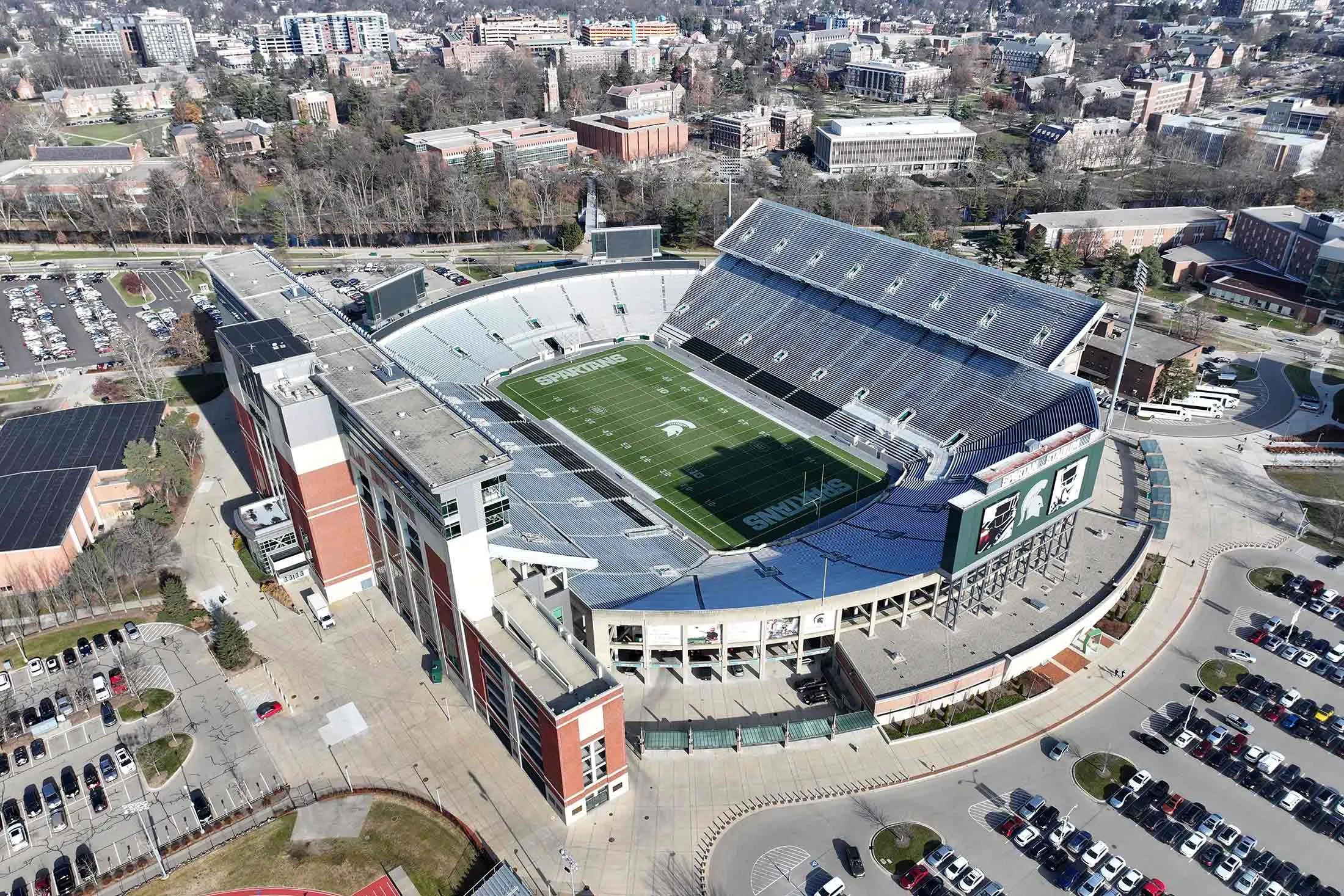 密歇根州立大学校园内的斯巴达体育场。摄影师:柯比·李/盖蒂图片社在临时教练哈伦·巴尼特执教的首场足球比赛中,斯巴达队以41-7输给了华盛顿队。在接下来的比赛中,他们再次遭遇惨败,对手是马里兰大学。密歇根州立大学于9月27日因故解雇了塔克,这也为球队的球员打开了转会窗口:他们可以在主教练离职后的30天内离开。