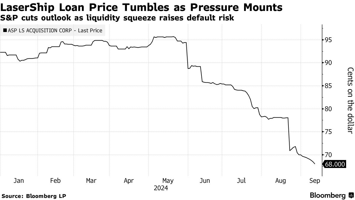这种风险已经拖累了LaserShip债务的价值。其13.75亿美元的第一留置权定期贷款将在2028年到期,报价约为每美元68.5美分,而其4.55亿美元的第二留置权贷款将在2029年到期,报价为每美元43美分,根据彭博社汇编的数据。