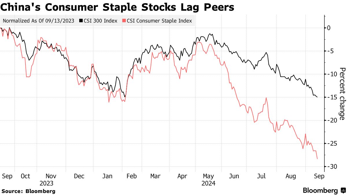 对中国股市的信心持续减弱,因多年持续的房地产危机、地缘政治紧张局势和盈利疲软使前景变得黯淡。CSI 300指数目前交易于自2019年1月以来的 最低水平,今年迄今已下跌约8%。消费品 是表现最差的行业之一,跌幅超过22%。