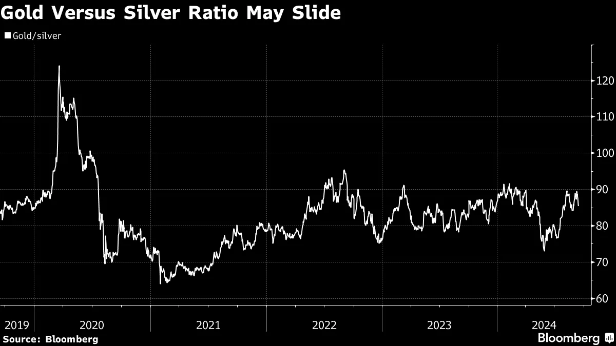彭博社之前的情景分析概述了为什么如果我们获得超过200个基点的利率削减,黄金应该在每盎司3000美元以上交易(目前约为2570美元)。期货市场预计这一切将在明年5月之前发生。两种贵金属之间的相关性分析表明,这将意味着白银价格超过每盎司37美元——相较现货价格的23%回报——而黄金与白银的比率将从现在的85下降到81。