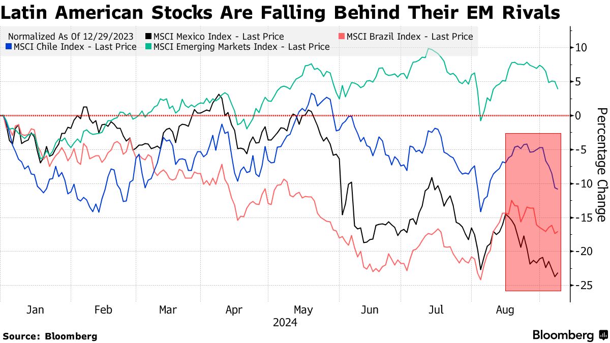 今年新兴市场表现最差的五种货币中有四种来自拉丁美洲。墨西哥和巴西的股市在美元计价方面落后于大多数主要同行,并且在过去三年中几乎没有新的上市公司。该地区在MSCI全球股票基准中的权重已降至二十年前的一个小部分。