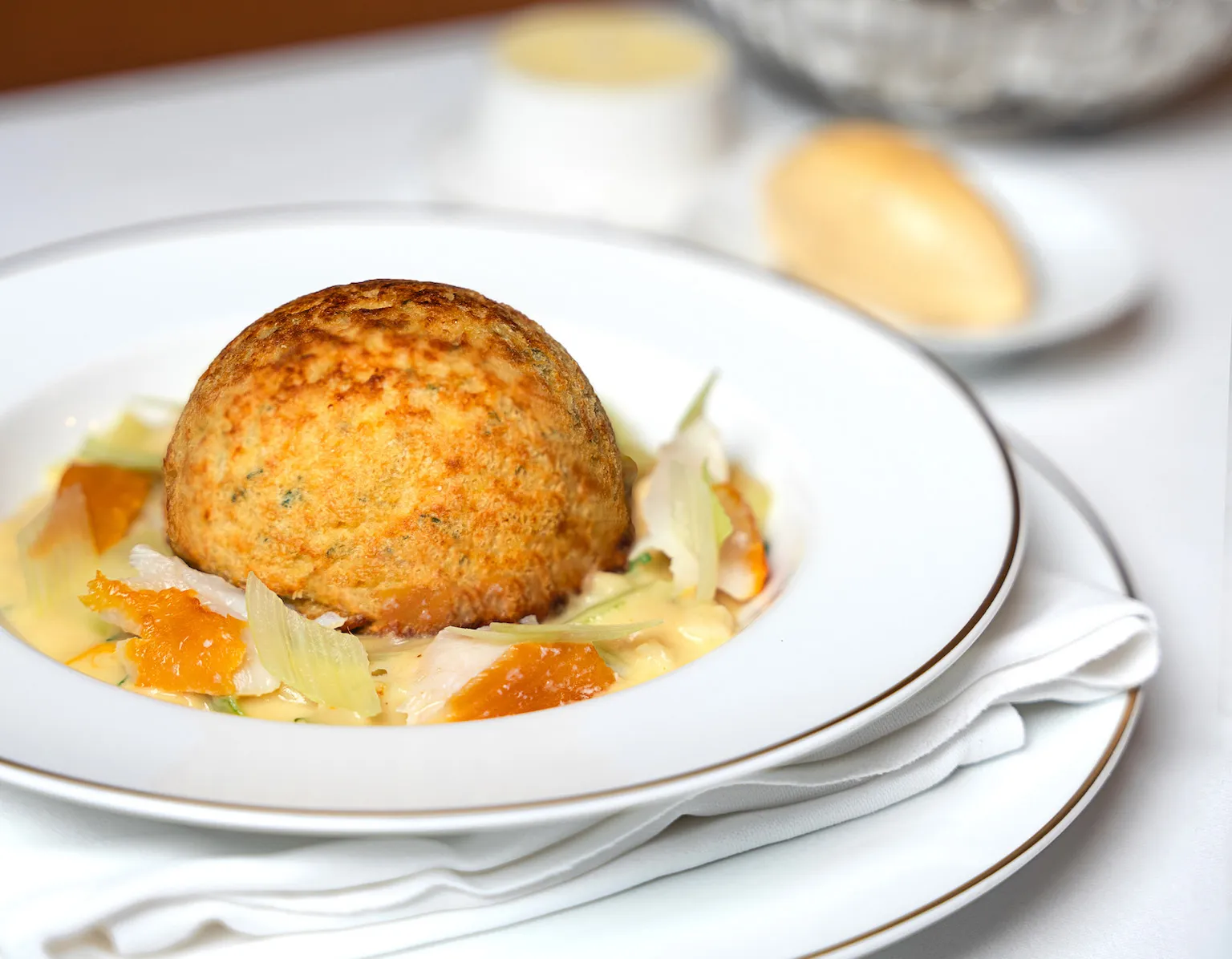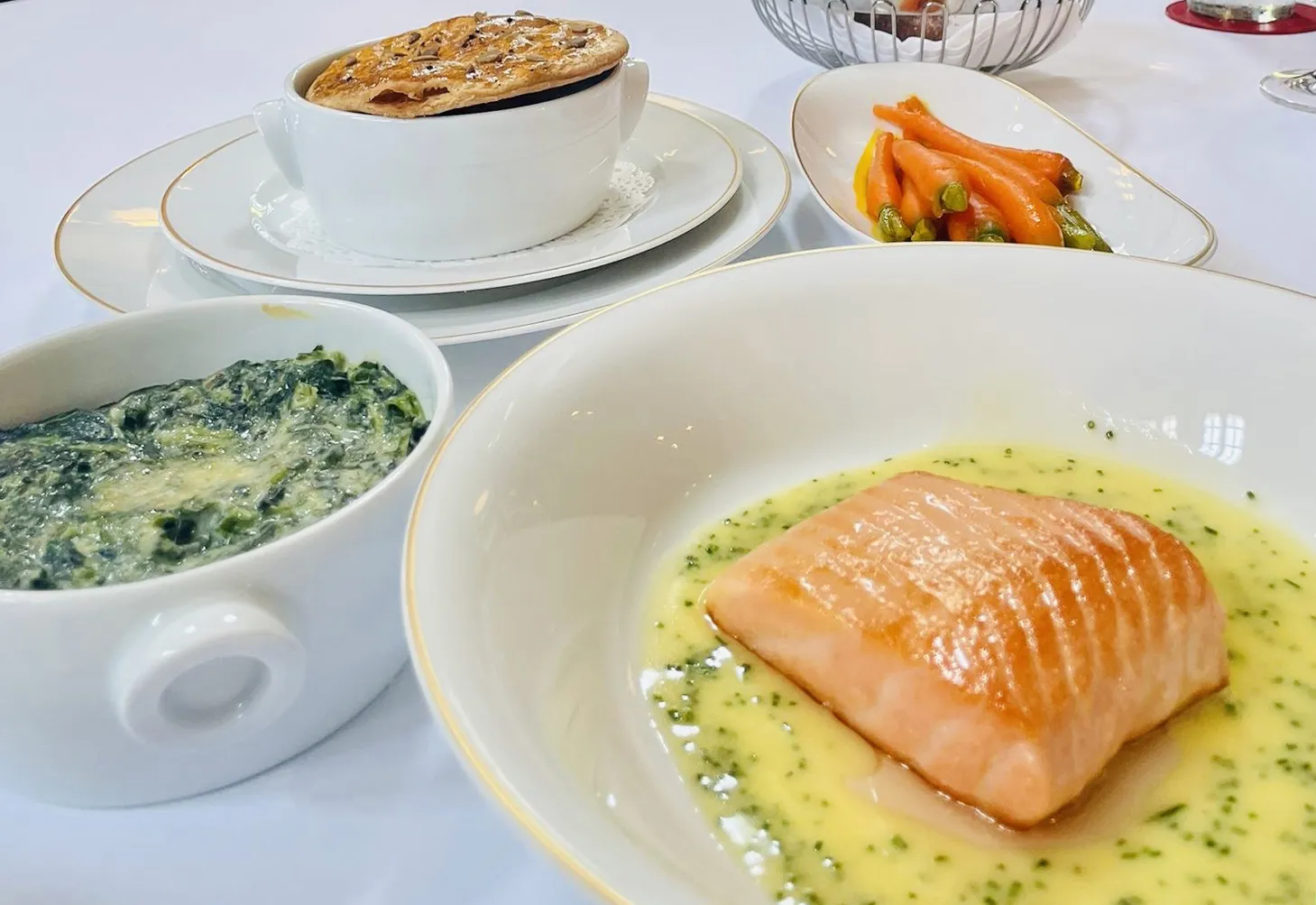 例如,经典的阿诺德·本内特烟熏鳕鱼舒芙蕾(HK$168)令人震惊地仍然有骨头。三黄鸡派(HK$688)顶部小而干硬——明显低于我在马修·柯克利厨师手下所爱的酥脆、黄油味的糕点外壳。奶油菠菜配白酱和上釉的格鲁耶尔奶酪(HK$148)有点干,而烤小胡萝卜(HK$128)则稍微冷了一点。