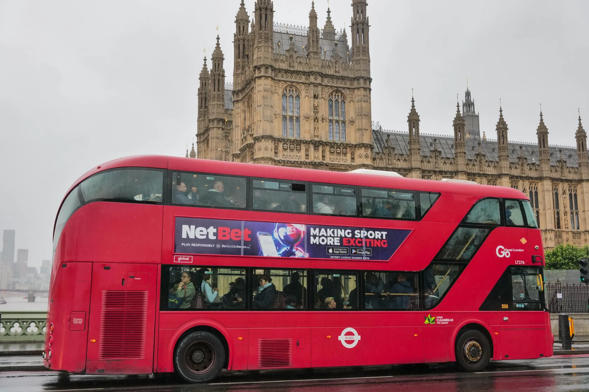 通勤者在伦敦的国会大厦旁乘坐公交车。