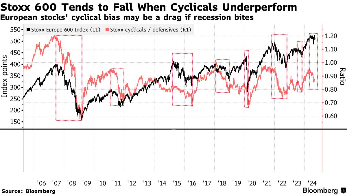 从定义上讲,欧洲市场比美国市场更具周期性,经济敏感行业约占基准Stoxx 600的三分之二。因此,该指数与这一群体的相关性通常非常高。但由于增长放缓和与中国的贸易风险的双重打击,这些公司的支持现在面临风险。