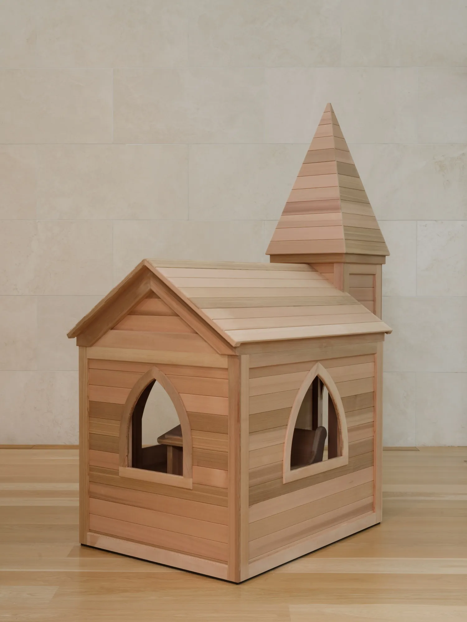 虽然“刷子”和纳舍尔展览中的其他作品围绕儿童主题,但访客首先会遇到的作品,通过博物馆的前窗可见,指向一个成年世界试图介入并重组儿童生活的地方。“幸福快乐的结局”是一个小型雪松教堂,大小如同玩具屋,带有哥特式尖拱窗和一个稍高于我头顶的尖塔。内部配有迷你长椅和讲坛,其圆润的形状灵感来自于对小泰克塑料家具和古董教堂长椅的无礼混搭。两个设计灵感出奇地协调,都具有弯曲的手臂和为安全而平滑的边缘。