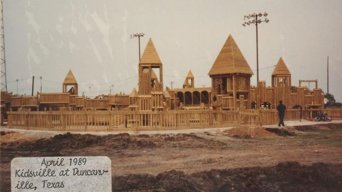 游乐场建筑师罗伯特·利瑟斯设计了木制游乐设施,这些设施由全国数百个社区建造,包括德克萨斯州邓肯维尔的儿童城。由邓肯维尔公共图书馆提供如果儿童城听起来像是你自己城镇中半记得的游乐场,你没有错:儿童城是1980年代社区建造的木制游乐场浪潮的一部分。这个运动由“秋千的约翰尼·苹果种子,”建筑师罗伯特·利瑟斯领导,他在1970年代为自己孩子的学校与志愿者一起建造了第一个木制攀爬结构。正如《时代》在2007年所写,“这个全志愿者项目所激发的社区精神让利瑟斯兴奋不已,以至于他将其作为他的专业。”在1980年代,利瑟斯获得了全国媒体的关注,以及来自芝麻街和罗杰斯先生的邻里的良好印章,导致他在全国范围内拥有数百个客户——包括邓肯维尔。