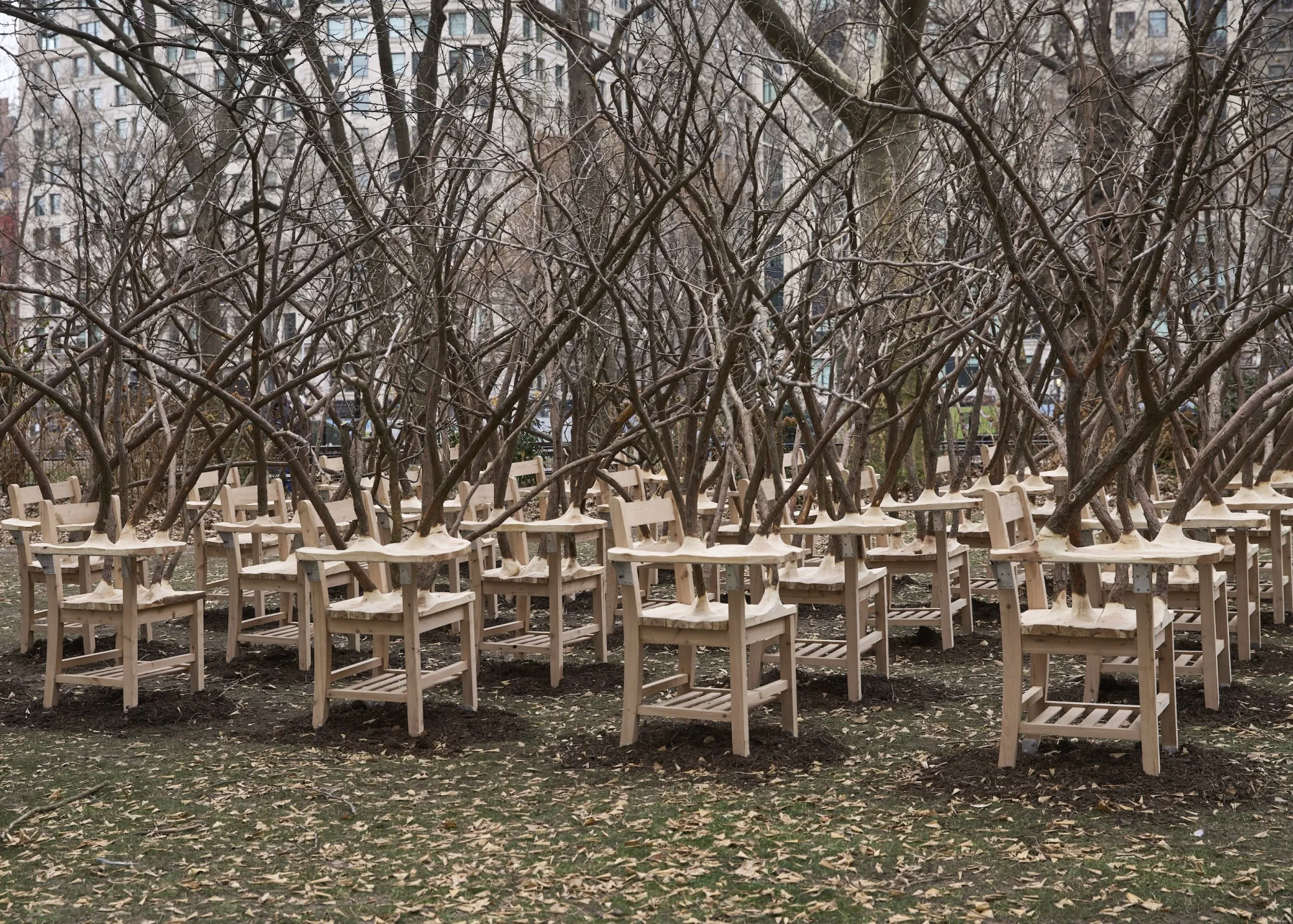海登的“荆棘 patch”(2022)将100个雪松和铝制学校桌雕塑带到了纽约的麦迪逊广场公园。摄影师:Yasunori Matsui/麦迪逊广场公园保护协会当“荆棘 patch”——学校桌作品——在麦迪逊广场公园展出时,几位评论家将其桌子的丛林与当代教育中的争议联系起来,包括获取障碍、课程争论、天性与养育,以及雕塑对黑人民族儿童故事《布雷兔》的引用。在那个故事中,兔子作为被奴役人民的替代者,不断试图用言辞摆脱麻烦。考虑到海登有一系列涉及编织头发的作品,你甚至可以将这些桌子与其分支的冠状结构解读为对黑人儿童头发的着装规范监管的反驳,反叛的发冠而非无法控制的丛林。