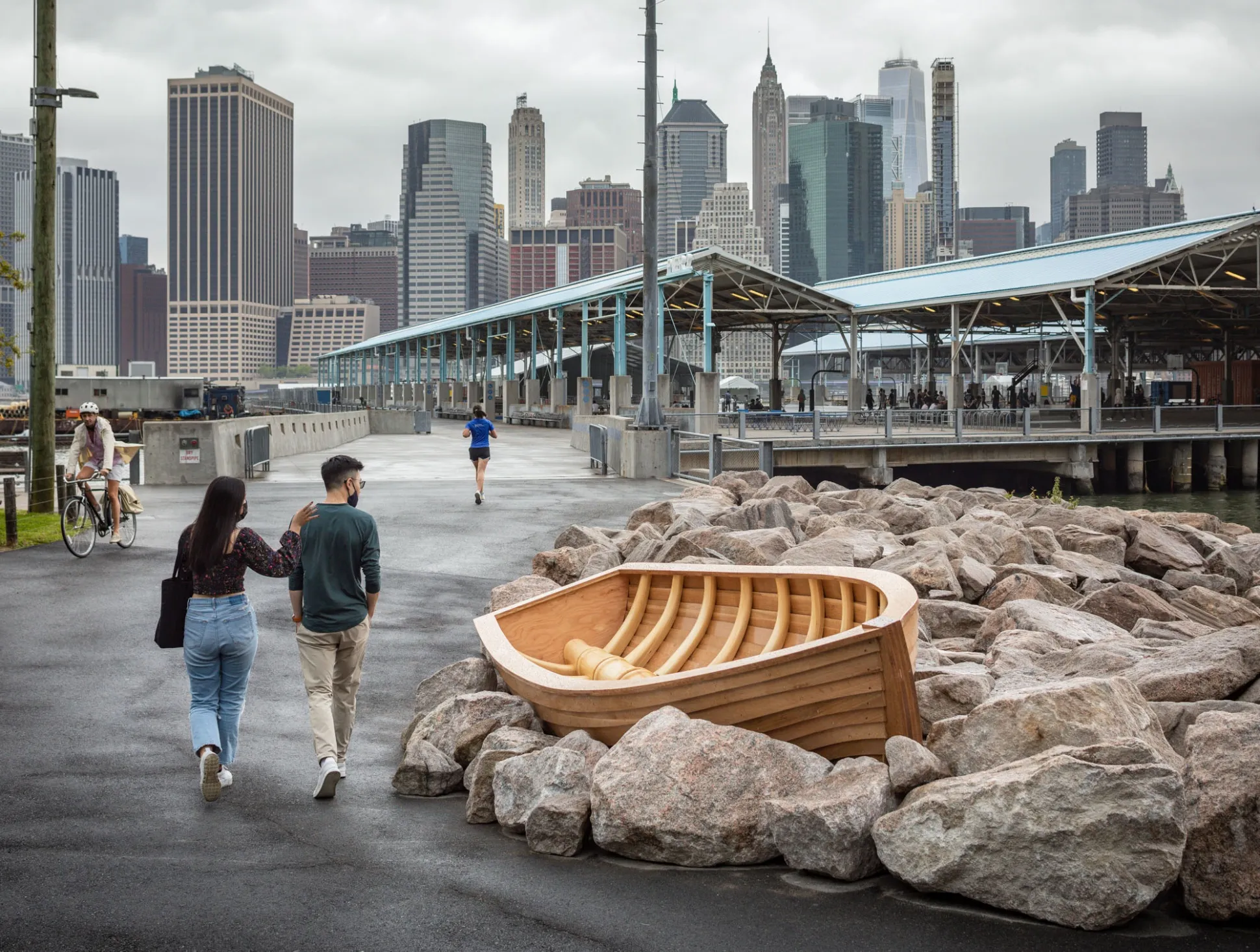 海登最终制作的作品有着同样刺人的背景故事,但外表更为光滑。“墨西哥湾流”是一只精美制作的橡木划艇,靠近时,显露出其巨大的肋骨框架——仿佛约拿的船和约拿的鲸鱼合并成了一个奇异的物体。海登借鉴了艺术史的参考,尤其是 温斯洛·霍默的画作,描绘了一位黑人男子独自在鲨鱼出没的水域中的小船,以及 凯瑞·詹姆斯·马歇尔的描绘,展现了同一场景的更理想化版本。孩子们立刻明白了。