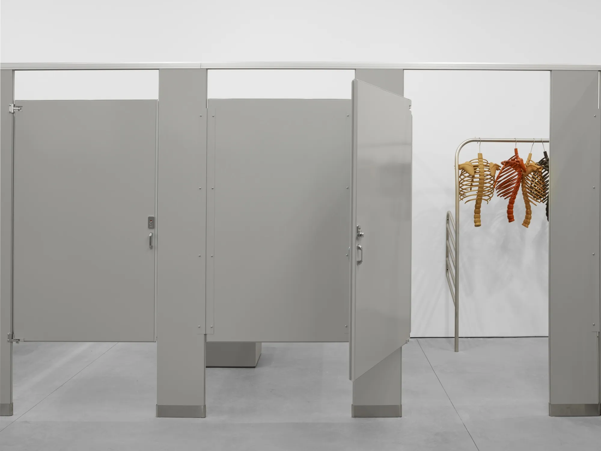 “Hughmans”,位于纽约Lisson画廊的一个装置,邀请观众走进卫生间隔间寻找艺术家的雕塑。摄影师:Mark Waldhauser/Lisson画廊