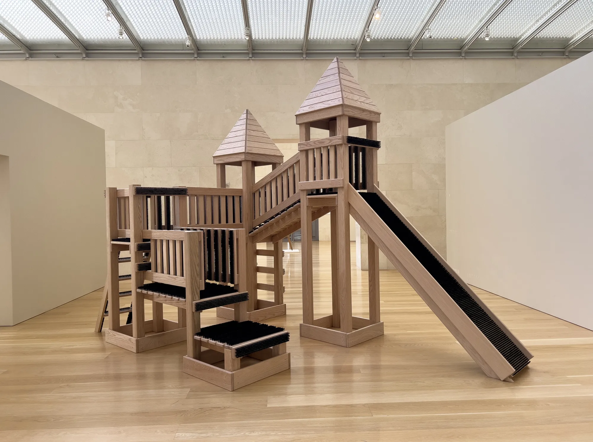海登为纳舍尔创作的游乐场,名为“刷子”,唤起了儿童空间的复杂历史,看起来像1990年代初的儿童乐园一样诱人,但内部隐藏着一些秘密。虽然海登的橡木结构有多个塔楼,像儿童乐园一样,吸引观众“爬上去”,但内部空间和表面覆盖着猪鬃刷。(而且,它在博物馆里,所以你实际上不能触摸。)毛刺的内部可以被解读为对父母想象中潜伏在非标准化、非塑料结构内的所有怪物的评论,从木刺和砷到欺凌者和变态,等待抓住他们的孩子。但其他解读也很容易想到,从对初级颜色聚乙烯景观的材料反驳——木头总让人感觉更坚固——到对直升机式育儿的批评。