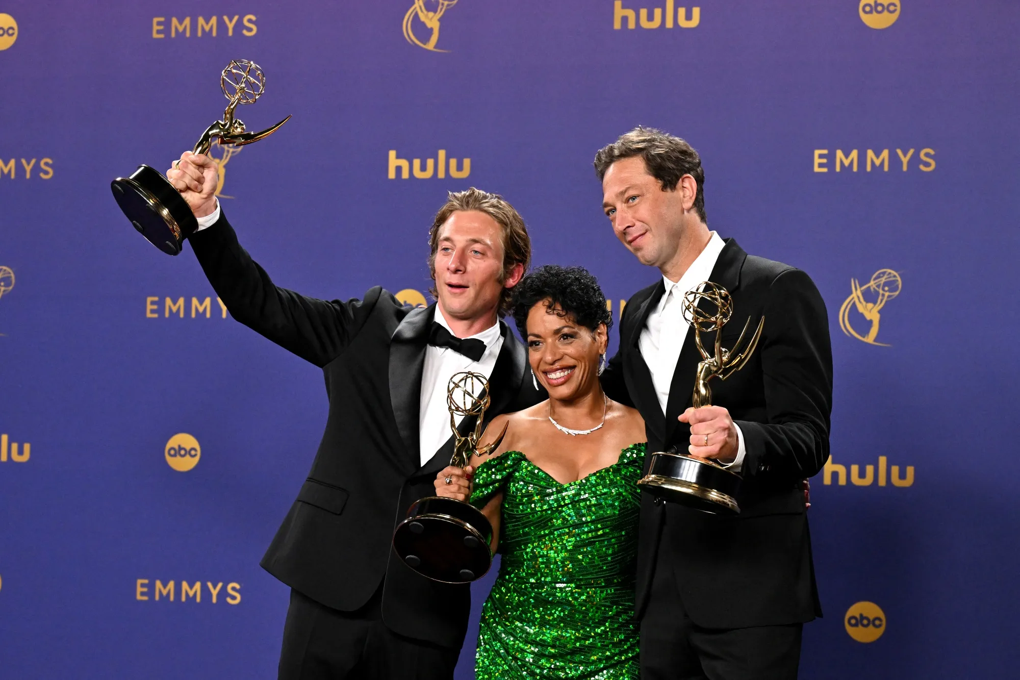 杰里米·艾伦·怀特、丽莎·科隆-扎亚斯和埃本·莫斯-巴赫拉赫在9月15日与他们的艾美奖合影。摄影师:罗宾·贝克/法新社/盖蒂图片社* 杰里米·艾伦·怀特,熊,FX