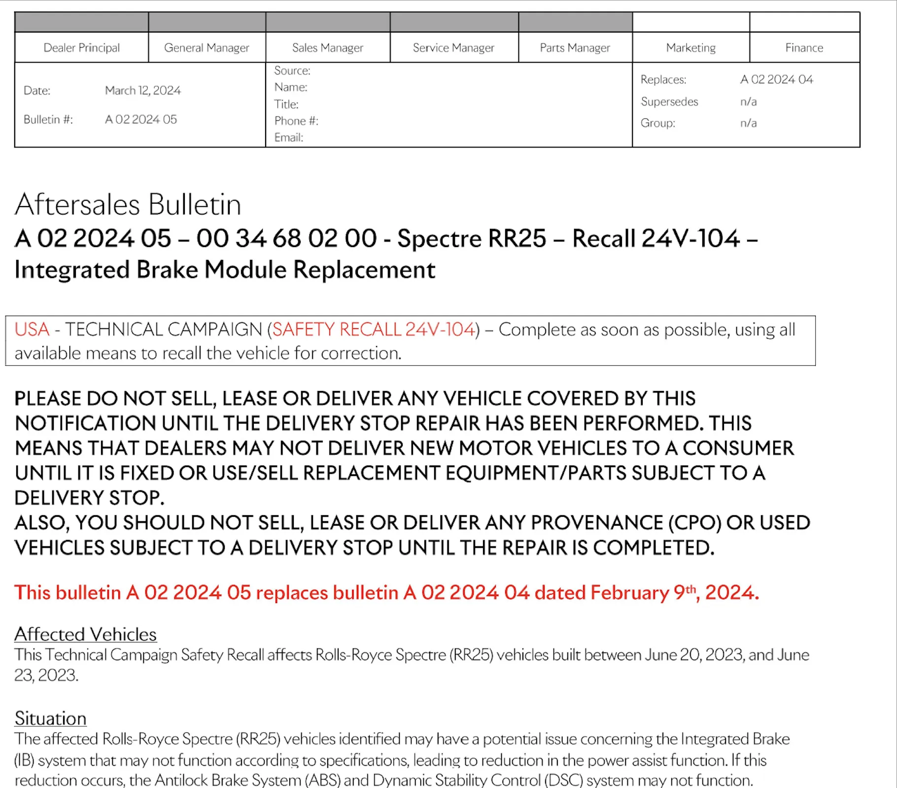 在大写字母中,这家豪华汽车制造商下令暂停所有在2023年6月20日至23日之间生产的幻影的销售和交付。该车型的制动系统可能存在缺陷,技师必须遵循26个步骤的程序来修复受影响的汽车。