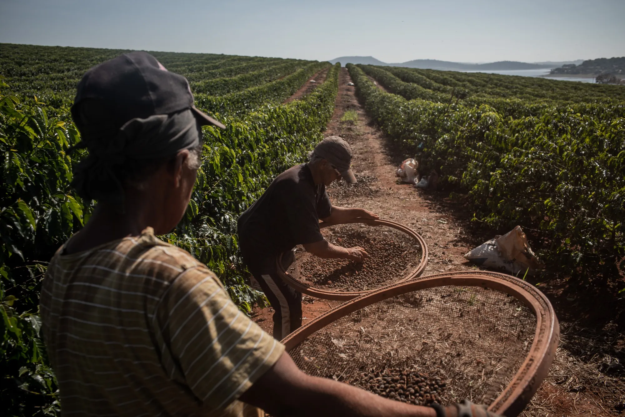 工人在巴西阿尔费纳斯的一处种植园进行咖啡豆的筛选。