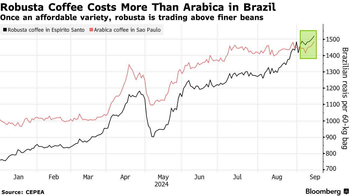 用于制作速溶咖啡和巴西酒吧及面包店流行的苦味浓缩咖啡的罗布斯塔豆,现在的交易价格高于温和且通常更贵的阿拉比卡品种。即使是该国通常出口给美国和欧洲烘焙商的超高品质优质豆也是如此。