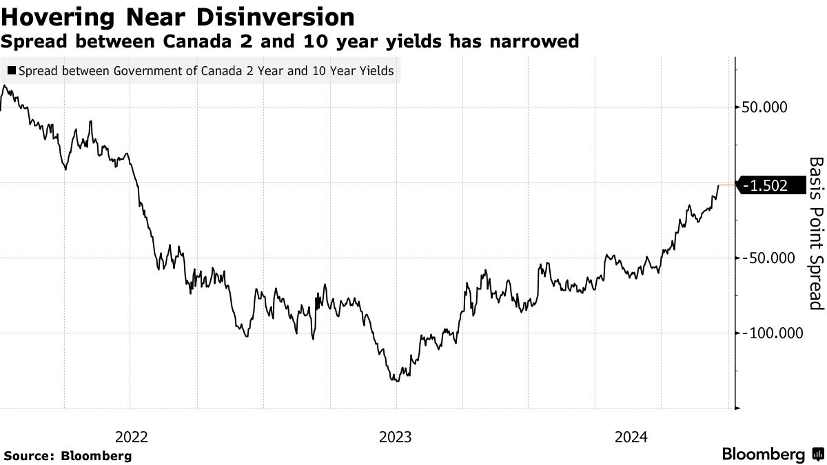 加拿大的基准两年期收益率首次在两年多以来短暂跌破十年期收益率,因为交易员们展望 美联储的降息,而加拿大央行行长蒂夫·麦克勒姆向《金融时报》发表了鸽派评论。