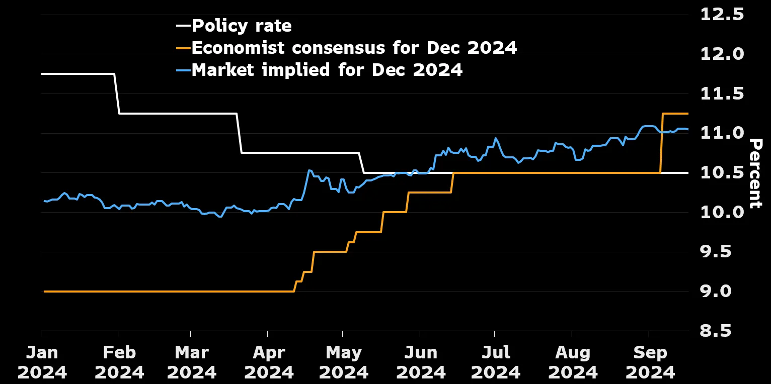 - 巴西中央银行——最近在5月降息——准备加息,尽管我们认为最终加息幅度将低于市场预期。尽管巴西中央银行可能会提到持续的货币疲软和财政风险,但我们认为一个重要动机是提升董事会的鹰派形象——包括其下一任负责人,加布里埃尔·加利波洛。