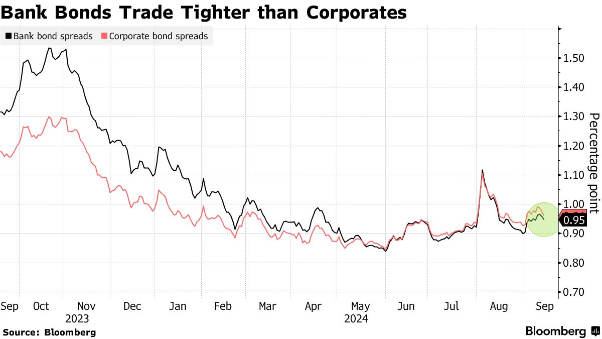利差在投资级银行债券上目前约为95个基点,比企业债券的 利差紧了一个基点。与去年同期相比,利差下降了超过30个基点,自5月以来表现优于企业债券。