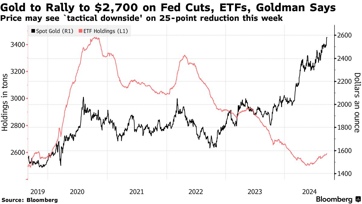 如果美联储本周仅选择降低25个基点,黄金可能面临短期小幅回调,但根据高盛集团的说法,这种金属随后将因流入黄金支持的交易所交易基金而上涨至创纪录水平。